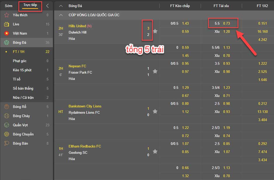 - Bước 1: Chọn trận đấu mà bạn muốn tham gia cá cược. Trận đấu này cần có tỷ lệ kèo live hoặc kèo rung.